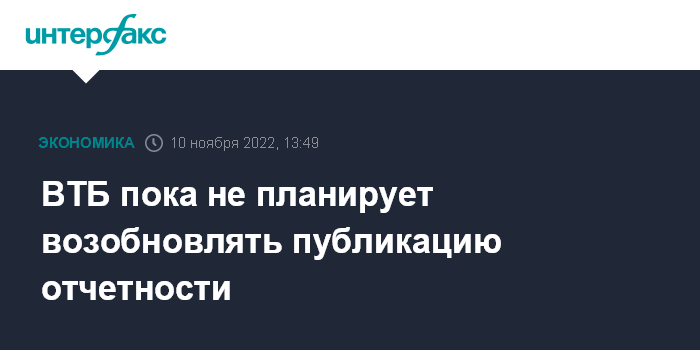 Москва. 10 ноября. INTERFAX.RU - ВТБ пока не планирует возобновлять публикацию финансовой отчетности, сообщил журналистам глава банка Андрей Костин в кулуарах форума "Финополис-2022".