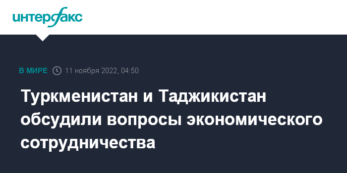 Москва. 11 ноября. INTERFAX.RU - В Ашхабаде состоялись политические консультации между министерствами иностранных дел Туркменистана и Таджикистана, в рамках которых стороны обсудили вопросы торгово-экономического и инвестиционного сотрудничества, сообщает МИД Туркменистана.
