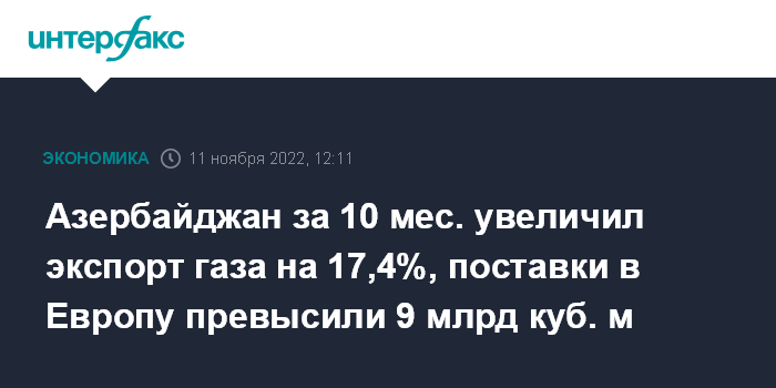 Москва. 11 ноября. INTERFAX.RU - Азербайджан в январе-октябре 2022 года увеличил экспорт газа на 17,4% - до 18,2 млрд кубометров, сообщил министр энергетики Пярвиз Шахбазов.