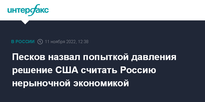 Москва. 11 ноября. INTERFAX.RU - Решение Вашингтона исключить Россию из списка стран с рыночной экономикой является продолжением попыток давления на Москву по всем возможным направлениям и не способствует стабилизации ситуации на мировых рынках, заявил пресс-секретарь президента Дмитрий Песков.