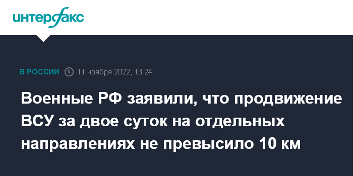 Москва. 11 ноября. INTERFAX.RU - Продвижение подразделений вооружённых сил Украины в районе реки Днепр за двое суток не превысило десяти километров на отдельных направлениях, противник остановлен на удалении 30-40 километров от района переправ через водную преграду, сообщил официальный представитель министерства обороны РФ Игорь Конашенков на брифинге в пятницу.