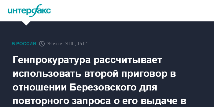 Москва. 26 июня. INTERFAX.RU - Генпрокуратура РФ намерена использовать второй приговор в отношении предпринимателя Бориса Березовского, осужденного за хищение денежных средств "Логоваза" и "Автоваза" для направления повторного запроса в Великобританию для его выдачи.