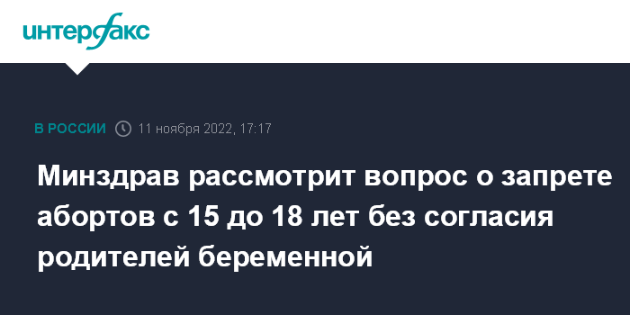 "Минздраву России (...) проработать вопросы и представить предложения (...) о целесообразности введения запрета на выполнение аборта несовершеннолетним 15-18 лет без согласия родителей (законных представителей)", - следует из протокола заседания Совета при правительстве РФ по вопросам попечительства в социальной сфере, предоставленного аппаратом вице-премьера.