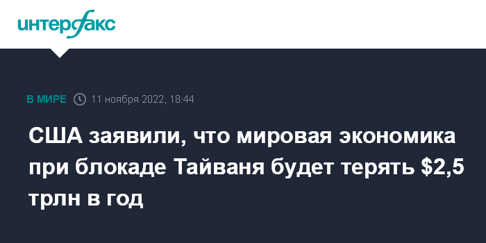 "Госдепартамент США поделился данными с партнерами и союзниками, согласно которым блокада Китаем Тайваня приведет к $2,5 трлн экономических потерь в год. Об этом сообщили шесть человек, изучивших такие материалы, которые составила аналитическая компания Rhodium Group", - пишет газета.