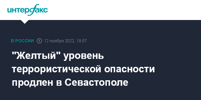 "Установлен высокий ("желтый") уровень террористической опасности на территории города Севастополя на период с 18:00 12 ноября на 15 суток до 18:00 27 ноября 2022 года", - говорится в сообщении.