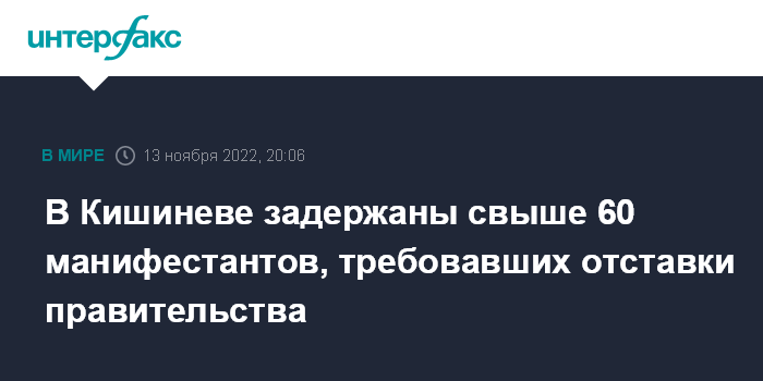 Москва. 13 ноября. INTERFAX.RU - Во время акции протеста в Кишиневе в воскресенье полиция задержала более 60 человек, сообщили "Интерфаксу" в Генеральном инспекторате полиции Молдавии.