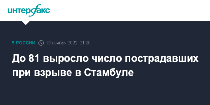 Москва. 13 ноября. INTERFAX.RU - До 81 человека увеличилось количество пострадавших в результате взрыва в центре Стамбула, шестеро погибли, сообщает Yeni Safak со ссылкой на вице-президента страны Фуата Октая.