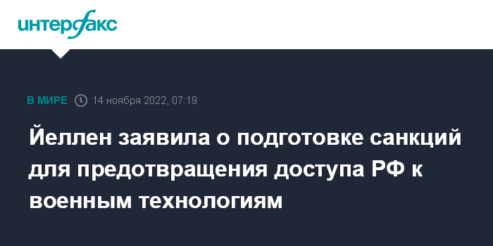Москва. 14 ноября. INTERFAX.RU - Соединенные Штаты планируют ввести санкционные меры в отношении ряда физических лиц и компаний, которые, по данным Минфина США, якобы способствуют закупкам Россией технологий военного назначения", сообщила американский министр финансов Джанет Йеллен.