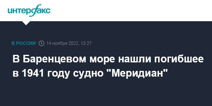 Москва. 14 ноября. INTERFAX.RU - Гидрографическое судно "Меридиан", погибшее в бою с немецкими эсминцами в августе 1941 года, обнаружено в Баренцевом море, сообщил Северный флот в понедельник.