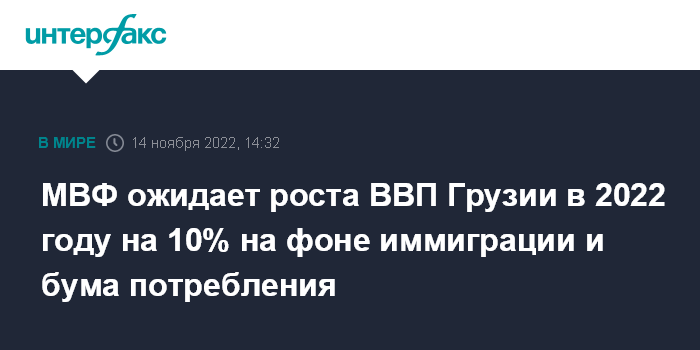 Москва. 14 ноября. INTERFAX.RU - Международный валютный фонд скорректировал прогноз по росту экономики Грузии в 2022 году, повысив его до 10%, тогда как в сентябре ожидал роста на 9%.