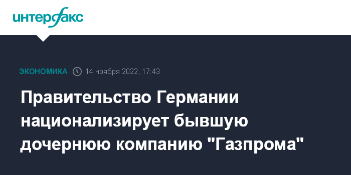 Москва. 14 ноября. INTERFAX.RU - Власти Германии решили национализировать бывшую дочернюю компанию "Газпрома" Gazprom Germania. Она в июне сменила название на SEFE Securing Energy for Europe GmbH.