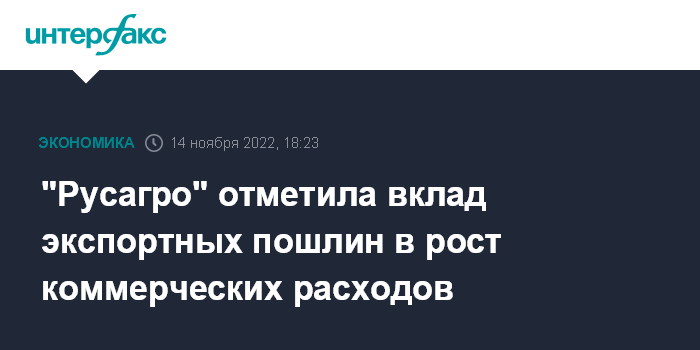 Москва. 14 ноября. INTERFAX.RU - Одним из ключевых драйверов роста коммерческих расходов группы "Русагро" стали пошлины на экспорт из России зерновых и масличных культур.