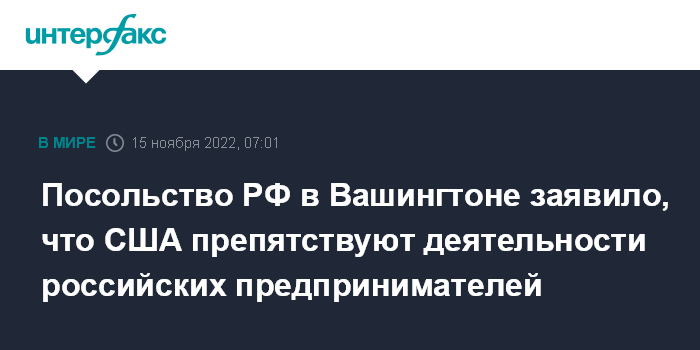 Москва. 15 ноября. INTERFAX.RU - Дипломатическое представительство РФ в Вашингтоне в комментарии, опубликованном в социальной сети, отмечает, что США своими санкциями демонстрируют стремление поддерживать токсичную атмосферу вокруг российских предпринимателей.