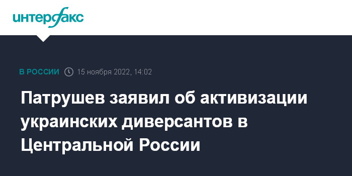 Москва. 15 ноября. INTERFAX.RU - Украинские разведывательно-диверсионные группы активизировались в Центральной России, особенно в приграничных регионах, заявил секретарь Совета безопасности РФ Николай Патрушев.