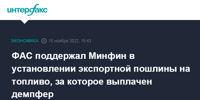 Москва. 15 ноября. INTERFAX.RU - Федеральная антимонопольная служба поддерживает Минфин в установлении экспортной пошлины на топливо, за которое выплачивается демпфер, сообщили "Интерфаксу" в пресс-службе ФАС.