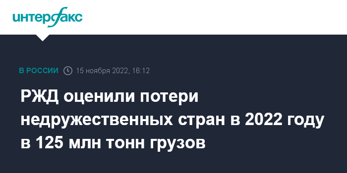 Москва. 15 ноября. INTERFAX.RU - По прогнозу ОАО "РЖД" недружественные страны до конца 2022 года потеряют 125 млн тонн грузов из-за введенных ограничений, заявил глава компании Олег Белозеров на пленарной сессии форума "Транспортная неделя 2022".