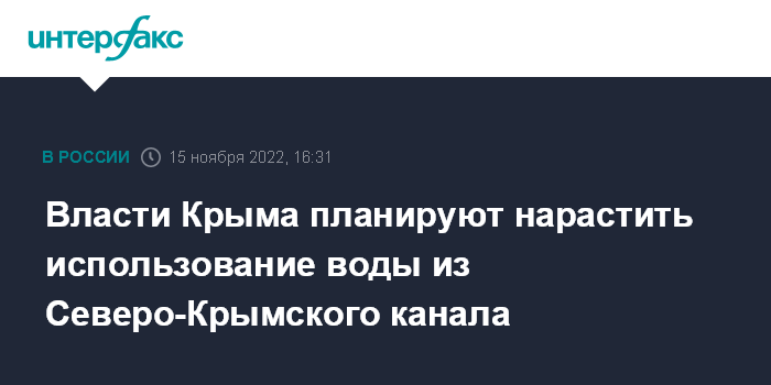 Москва. 15 ноября. INTERFAX.RU - Власти Крыма рассчитывают в 2023 году увеличить площадь орошения посевов водой из Северо-Крымского канала и увеличить подачу воды по нему до 270-280 млн кубометров за сезон - на 33%, сообщил советник председателя госкомитета по водному хозяйству и мелиорации республики Роман Захаров.