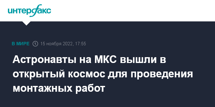 Москва. 15 ноября. INTERFAX.RU - Американские астронавты Джош Кассада и Фрэнк Рубио во вторник вышли в открытый космос с борта Международной космической станции (МКС) для проведения на ее поверхности монтажных работ в целях модернизации системы энергоснабжения. Об этом сообщило Национальное управление США по аэронавтике и исследованию космического пространства (NASA, НАСА).