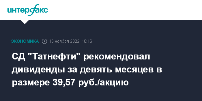 Москва. 16 ноября. INTERFAX.RU - Совет директоров "Татнефти" рекомендовал дивиденды за 9 месяцев в размере 39,57 руб./акцию с учетом ранее выплаченных дивидендов за первое полугодие, говорится в сообщении компании.