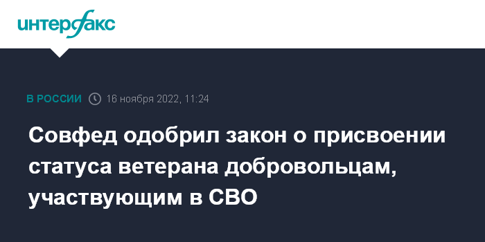 Москва. 16 ноября. INTERFAX.RU - Совет Федерации одобрил закон о предоставлении статуса ветерана боевых действий добровольцам, участвующим в специальной военной операции.