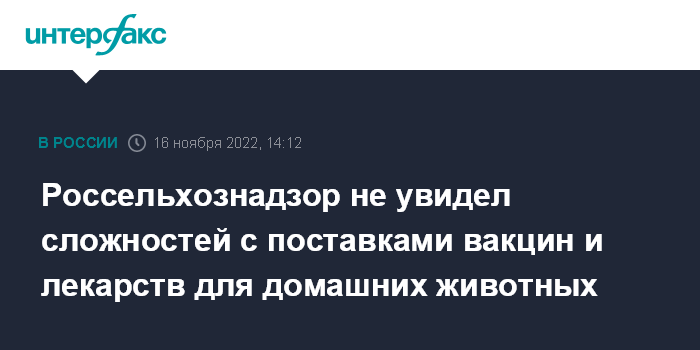 Москва. 16 ноября. INTERFAX.RU - Россельхознадзор не видит сложностей с поставками вакцин и лекарственных препаратов для домашних животных. Не фиксирует служба и случаев запрета на ввоз животных-компаньонов, вакцинированных отечественными препаратами от бешенства, из России в третьи страны.