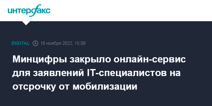 Москва. 16 ноября. INTERFAX.RU - Минцифры РФ закрыло сервис подачи заявлений на отсрочку от мобилизации сотрудников IT-компаний и телеком-операторов, соответствующая форма на портале Госуслуг уже недоступна, убедились корреспонденты "Интерфакса".