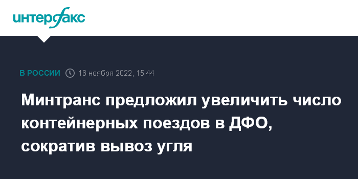 Москва. 16 ноября. INTERFAX.RU - Минтранс предложил увеличить количество контейнерных поездов в направлении Дальнего Востока за счет сокращения вывоза угля. Это одно из предложений по стабилизации ситуации с вывозом контейнеров из портов Дальнего Востока, которые назвал глава ведомства Виталий Савельев на совещании у президента.