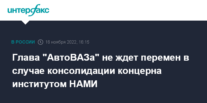 Москва. 16 ноября. INTERFAX.RU - Работа "АвтоВАЗа" не претерпит изменений в случае консолидации компании подведомственным Минпромторгу ФГУП "НАМИ", сообщил журналистам президент "АвтоВАЗа" Максим Соколов в кулуарах "Транспортной недели 2022".