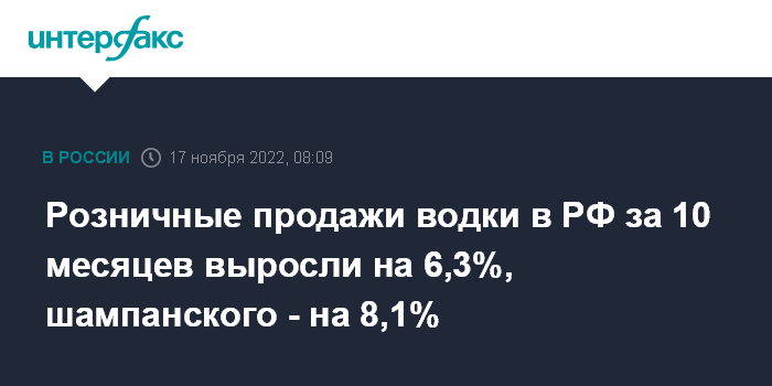 Москва. 17 ноября. INTERFAX.RU - Розничные продажи водки за 10 месяцев 2022 года по сравнению с аналогичным периодом прошлого года выросли на 6,3%, до 62,546 млн декалитров (дал), сообщает Росалкогольрегулирование.