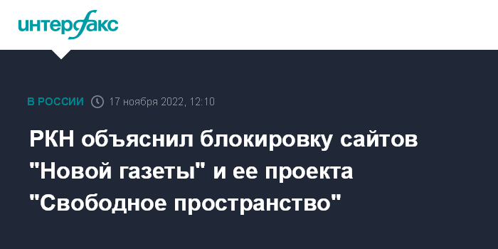 Москва. 17 ноября. INTERFAX.RU - Роскомнадзор (РКН) ограничил доступ к сайтам "Новой газеты" и онлайн-проекта редакции "Свободное пространство" как к "зеркалам" ранее навсегда заблокированной "Новой рассказ-газеты", сообщили "Интерфаксу" в ведомстве.