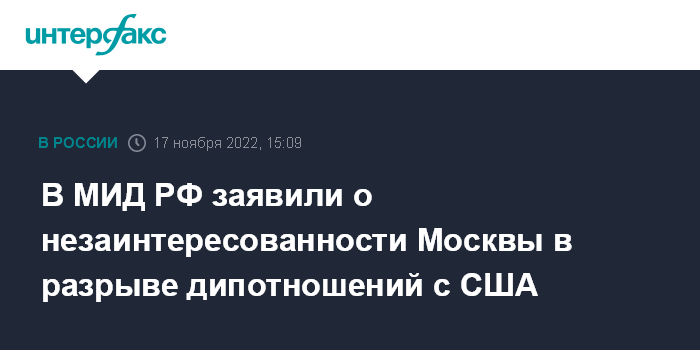 Москва. 17 ноября. INTERFAX.RU - В Москве не заинтересованы в разрыве дипломатических отношений с США, заявил в четверг замглавы МИД РФ Сергей Рябков.