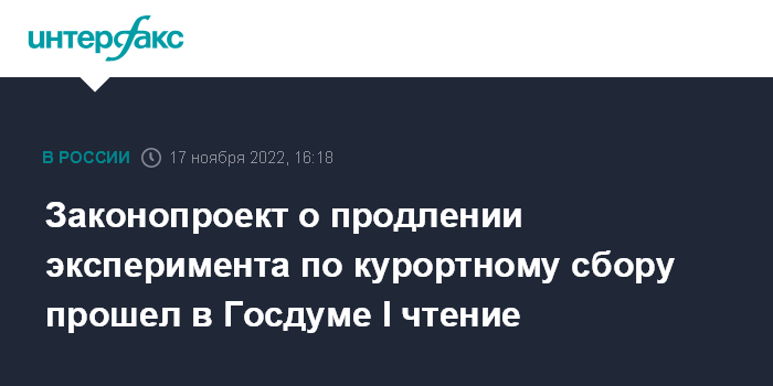 Москва. 17 ноября. INTERFAX.RU - Госдума приняла в первом чтении законопроект, который продлевает до 2027 года срок проведения в РФ эксперимента по взиманию курортного сбора, ко второму чтению срок может быть сокращен до 2025 года и в контур эксперимента могут быть добавлены новые регионы.