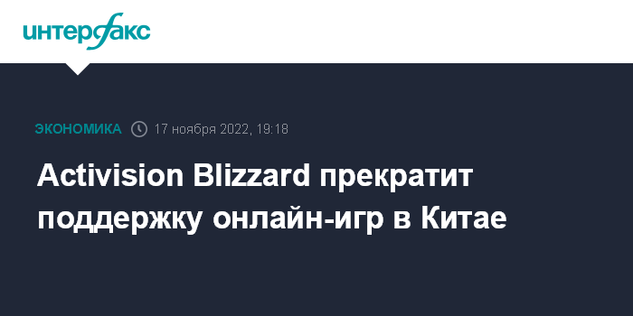 Москва. 17 ноября. INTERFAX.RU - Американский разработчик видеоигр Activision Blizzard в январе остановит работу большинства игровых онлайн-сервисов в Китае, включая поддержку игр World of Warcraft, StarCraft и Diablo III.