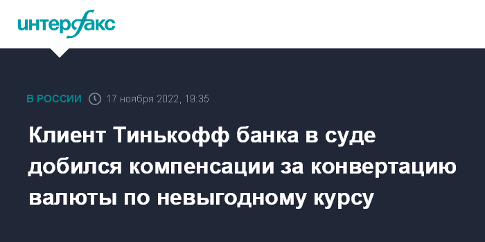 Москва. 17 ноября. INTERFAX.RU - Клиент Тинькофф банка Дмитрий Шайдулин через суд смог добиться компенсации от кредитной организации за самовольную конвертацию валютной выручки по невыгодному курсу.