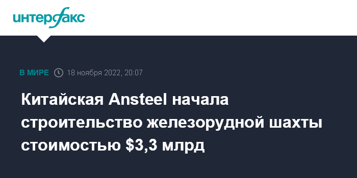 Москва. 18 ноября. INTERFAX.RU - Китайская сталелитейная Ansteel Mining Co начала строительство железорудной шахты на территории провинции Ляонин, сообщает агентство "Синьхуа".
