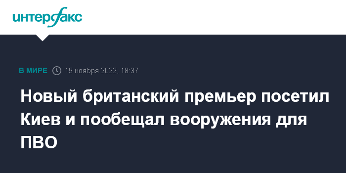 Москва. 19 ноября. INTERFAX.RU - Премьер-министр Великобритании Риши Сунак в субботу посетил Киев, провел там переговоры с президентом Украины Владимиром Зеленским и пообещал ему дальнейшую военную помощь, сообщает Даунинг-стрит.