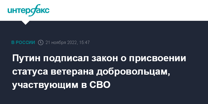 Москва. 21 ноября. INTERFAX.RU - Президент РФ подписал закон о предоставлении статуса ветерана боевых действий добровольцам, участвующим в специальной военной операции (СВО).