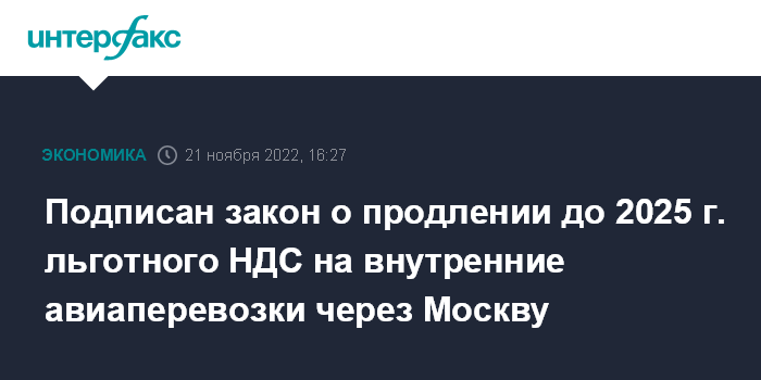 Москва. 21 ноября. INTERFAX.RU - Президент РФ подписал закон, по которому до 31 декабря 2024 года продлевается действие НДС в размере 10% на услуги по внутренним воздушным перевозкам пассажиров и багажа при условии, что пункт отправления, пункт назначения расположены на территории Московской области и территории города федерального значения Москвы.