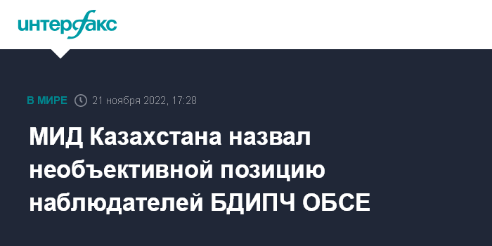 Москва. 21 ноября. INTERFAX.RU - Предварительные выводы и заключения миссии БДИПЧ ОБСЕ о президентских выборах в Казахстане страдают отсутствием объективности и ставят под вопрос эффективность этого института, заявил МИД Казахстана, напомнив, что до сих пор в республике поддерживали организацию.