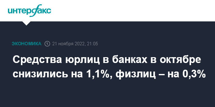 Москва. 21 ноября. INTERFAX.RU - Средства юрлиц в российских банках в октябре 2022 года сократились на 467 млрд рублей (или 1,1%) после роста в сентябре на 939 млрд рублей (+2,3%) и составили на 1 ноября 40,847 трлн рублей, говорится в обзоре ЦБ РФ о развитии банковского сектора.