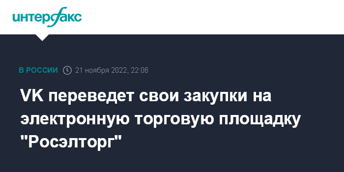 Москва. 21 ноября. INTERFAX.RU - Интернет-компания VK переводит свои закупки на электронную торговую площадку (ЭТП) "Росэлторг" (ЕЭТП, "Единая электронная торговая площадка"), говорится в сообщении компаний.