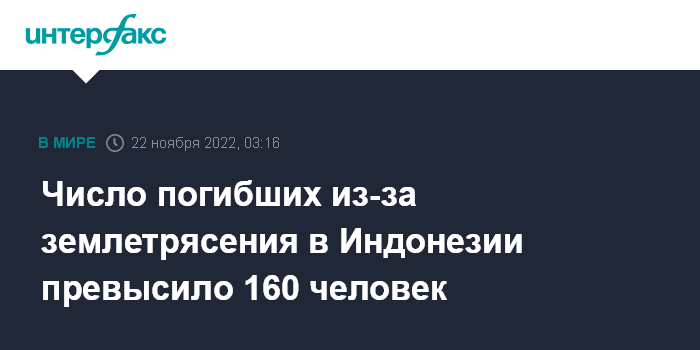 Москва. 22 ноября. INTERFAX.RU - Количество жертв мощного землетрясения на индонезийском острове Ява достигло 162 человек, сообщает Associated Press со ссылкой на местные власти.