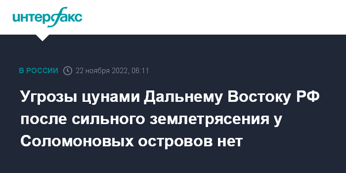 "Угрозы цунами для дальневосточного побережья России не существует. Землетрясение в районе Соломоновых островов сильное, слабое цунами в том районе уже регистрируется. Угроза цунами объявлена Тихоокеанским центром (центр предупреждения о цунами - ИФ) для ближайших районов в пределах 300 км от эпицентра", - пояснила она.