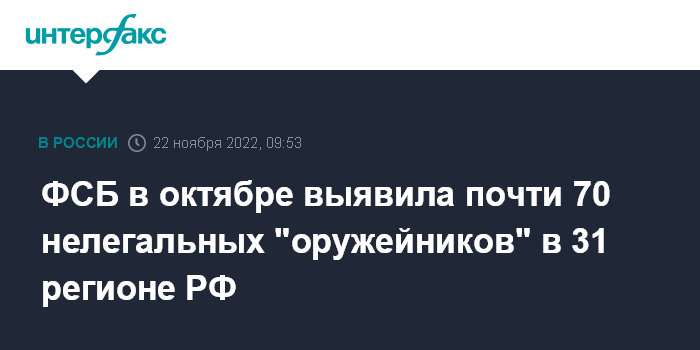 Москва. 22 ноября. INTERFAX.RU - В октябре в 31 регионе России выявлены 68 так называемых нелегальных оружейников, прекращена работа 31 подпольной мастерской по модернизации оружия, сообщает во вторник Центр общественных связей (ЦОС) ФСБ.