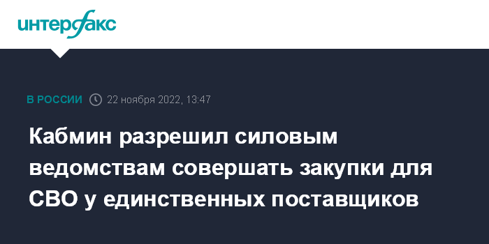Москва. 22 ноября. INTERFAX.RU - Правительство РФ предоставило право силовым ведомствам проводить закупки для нужд специальной военной операции у единственных поставщиков.