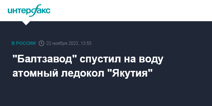 Москва. 22 ноября. INTERFAX.RU - АО "Балтийский завод" (входит в АО "Объединенная судостроительная корпорация", ОСК) во вторник спустило на воду третий серийный универсальный атомный ледокол "Якутия" проекта 22220, передал корреспондент "Интерфакса" с церемонии спуска.