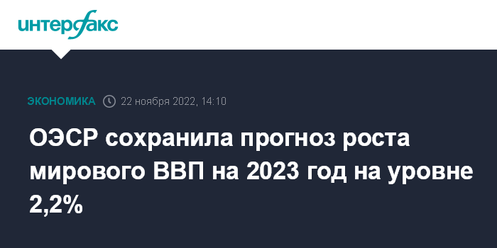 Москва. 22 ноября. INTERFAX.RU - Организация экономического сотрудничества и развития (ОЭСР) сохранила прогноз роста мирового ВВП на 2023 год на уровне 2,2%.