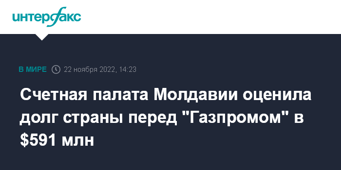 Москва. 22 ноября. INTERFAX.RU - Счетная палата Молдавии подсчитала, что долг предприятия "Молдовагаз" перед "Газпромом" на конец 2021 года составил $590,8 млн.