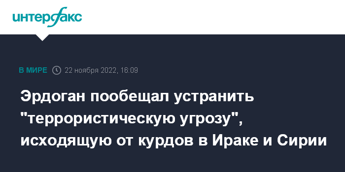 Москва. 22 ноября. INTERFAX.RU - Президент Турции Реджеп Тайип Эрдоган, говоря об ударах турецких военных по позициям курдских военизированных формирований на севере Сирии и Ираке, заявил, что устранит исходящую от них "террористическую угрозу", сообщают турецкие СМИ.