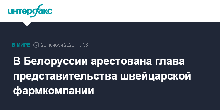 Москва. 22 ноября. INTERFAX.RU - Генпрокуратура Белоруссии сообщила, что арестована глава представительства швейцарской фармкомпании Alpen Pharma.